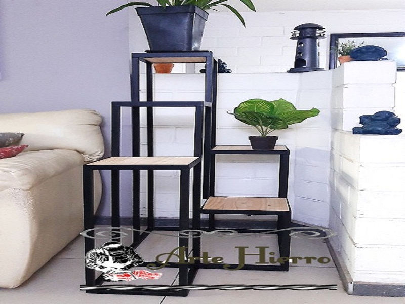 Estante para macetas fabricado en hierro con perfil cuadrado de 20x20x1.5mm 5 bases para macetas de 23X23cm madera de pino de 1" de espesor Pintado manual con pintura antioxido y pintura para acabado opaca.